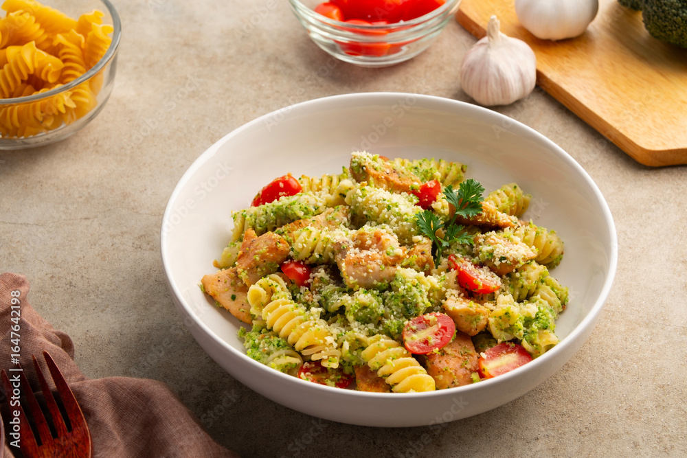 CHICKEN PESTO FUSILLI,fusilli pasta with broccoli pesto sauce and grilled chicken breast, cherry tomato in a plate.