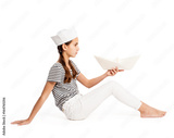 little marine holding a paper boat on a white background