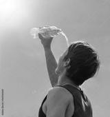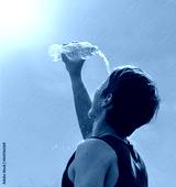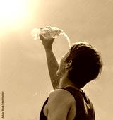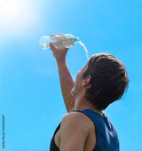 Young man splashing and pouring fresh water from a bottle on his head