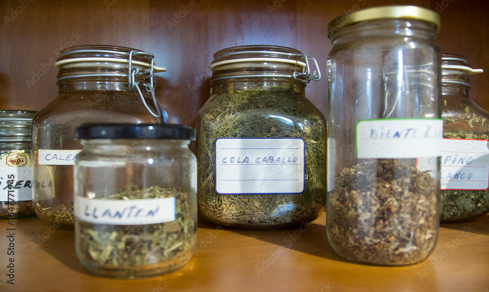 Alacena con hierbas medicinales en tarros de cristal.