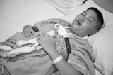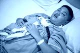 Asian boy wearing Sleep Apnea Diagnostic medical device Kit. Sleep Lab Test.