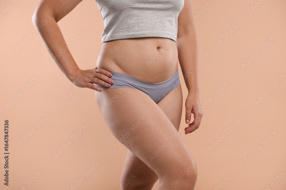 Liposuction. Woman in underwear on beige background, closeup