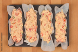 Raw dough for traditional Sardinian tomato focaccia (Sa Costedda) in four baking tins, placed on a wooden background