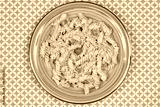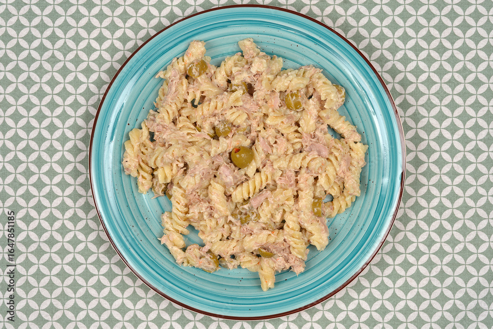 A blue plate with pasta with tuna, olives and cooking cream, placed on a geometrically patterned tablecloth