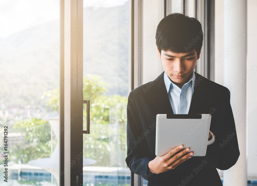Graduate students or Students college are using Tablet to find information about research or Using social networks Standing at the window with sun light. Education and social networks concept.