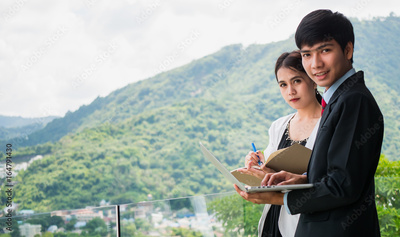 The boss and the Secretary are consulting about commercial real estate. The boss is looking for details on laptops and the Secretary are notes on the instructions of the boss.