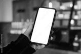 Female holds a mockup smartphone with a blank white screen. Concept for showcasing mobile apps, food delivery services, or social media platforms.