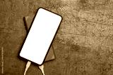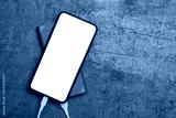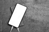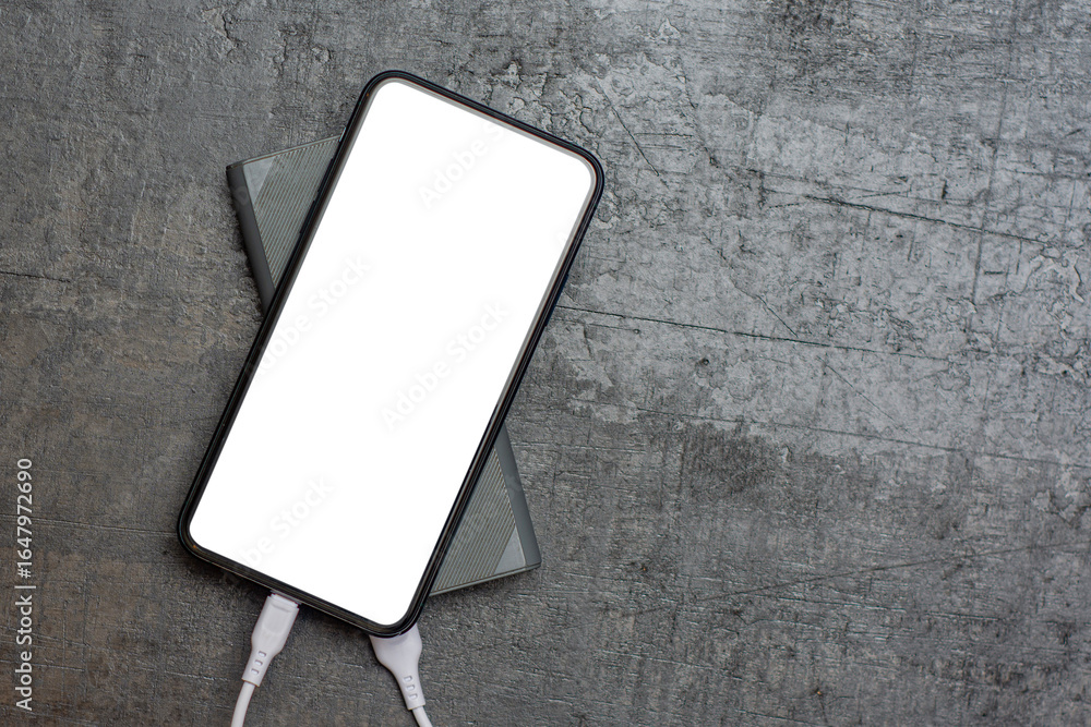 Mockup smartphone with a blank white screen is shown from a top-down perspective, connected to a portable power bank via a white cable against concrete background.