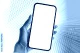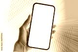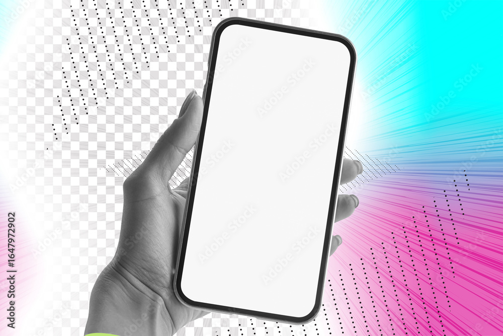 Creative smartphone mockup in hand, blank white screen for design artwork and app interface. Art collage with gradient background, halftone dots, and abstract lines for mobile presentations, UX UI.