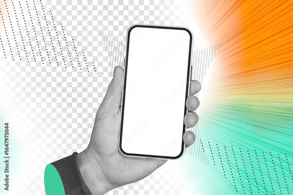 Creative smartphone mockup in hand, blank white screen for design artwork and app interface. Art collage with gradient background, halftone dots, and abstract lines for mobile presentations, UX UI.