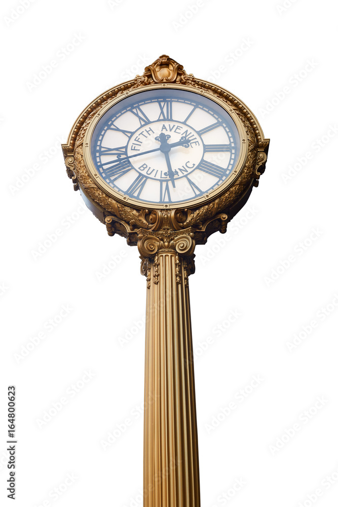 Fifth Avenue building golden clock isolated in New York, clipping path