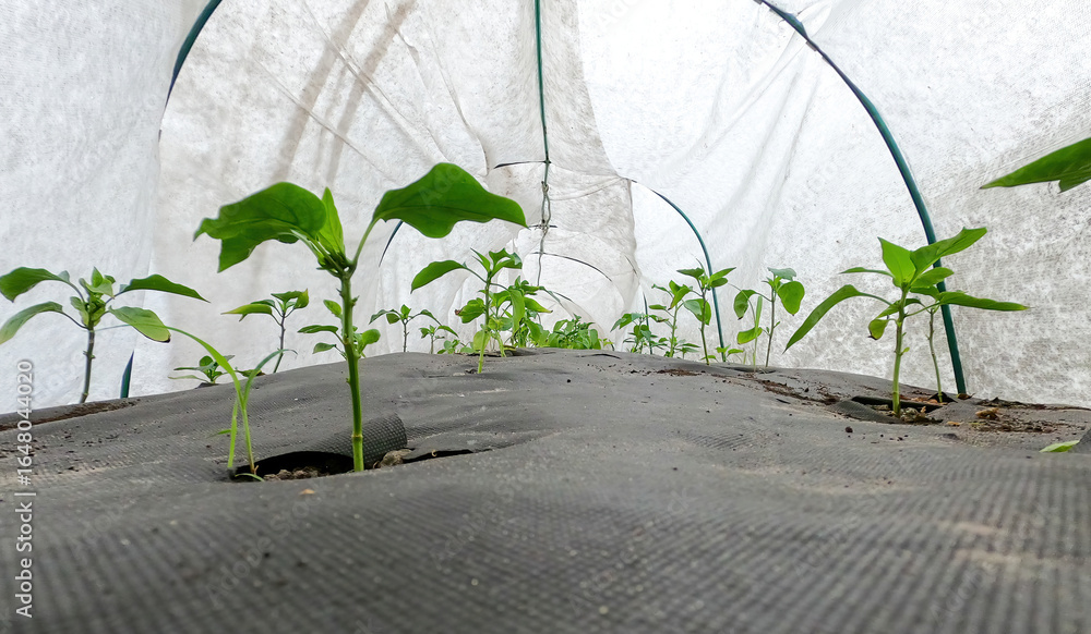 Growing pepper in a greenhouse. Pepper bushes on a spunbond. Planted pepper seedlings