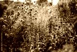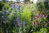 Blue echinops blooming by echinacea and agastache in summer garden. Globe thistle flowers by pennisetum ornamental grass