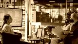Diverse management group does strategic thinking next to chroma key, analyzing data to guide company decisions with research. Reviewing performance metrics and multicultural perspectives. Camera B.
