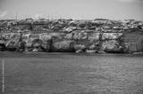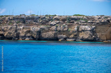 Boat trip and view on coastline of Favignana island with shallow bays with clear turquoise water, tuff rocks, abandoned quarries, caves, Egadi Islands near Sicily, Italy