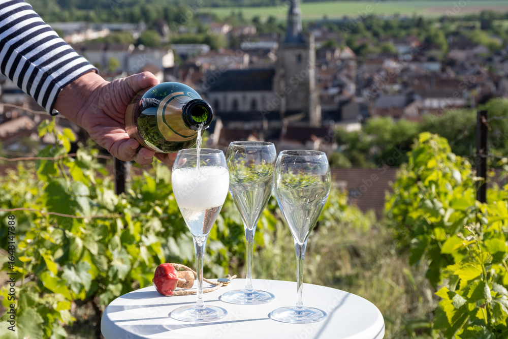 Pouring and tasting of dry sparkling wine brut, grand reserve, champagne in Ay-Champagne on green hilly vineyards in old wine making village in Vallee de la Marne, Champagne region, France