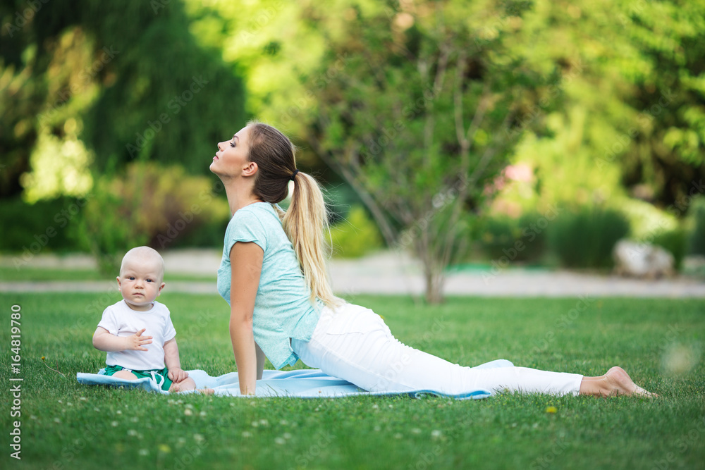 Mother and little son doing exercise outdoors. Sports concept