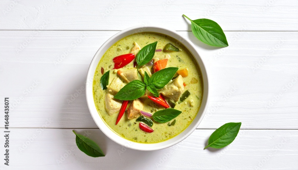Delicious Thai green curry with chicken and vegetables in a bowl, Thai green curry with basil garnish on a white wooden table