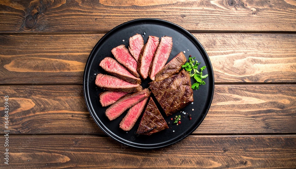 Perfectly cooked steak sliced on a black plate for the sophisticated home chef, Mouthwatering rare steak served fresh on a dark plate, perfect for fine dining