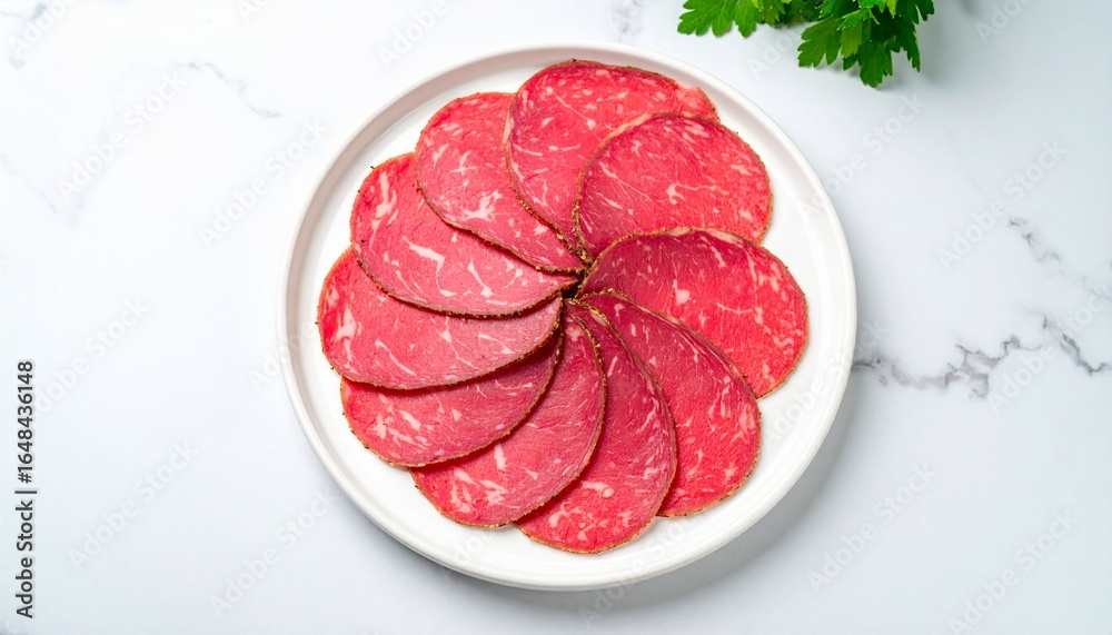 Pastrami Slices on a White Plate with Parsley, Classic Deli Meat Presentation on Marble Background, Cured beef perfection: Delicious pastrami slices artfully arranged on a white plate