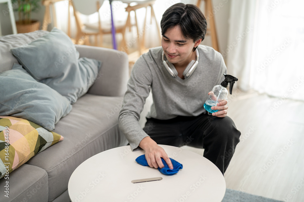 Asian young handsome man cleaning indoors in cozy room at home.