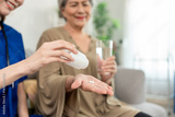 Asian caregiver give consultant to senior woman patient at nursing home.
