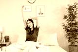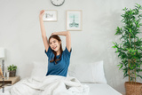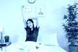 Asian young beautiful woman getting up from sleep on bed in the morning.