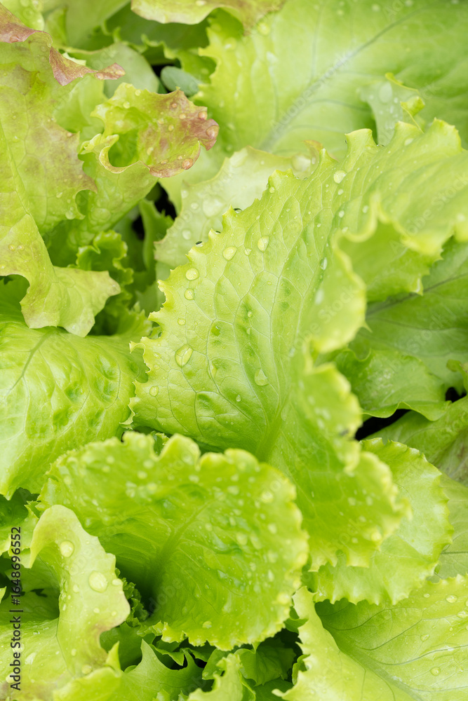 Healthy lettuce leaf macro with sparkling water droplets after summer rain