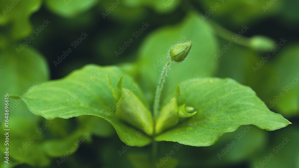 Small plant with large green leaves and fluffy closed bud in summer garden