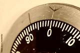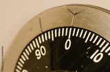 Closeup of a combination lock on a military-grade secure safe with the dial set to 0