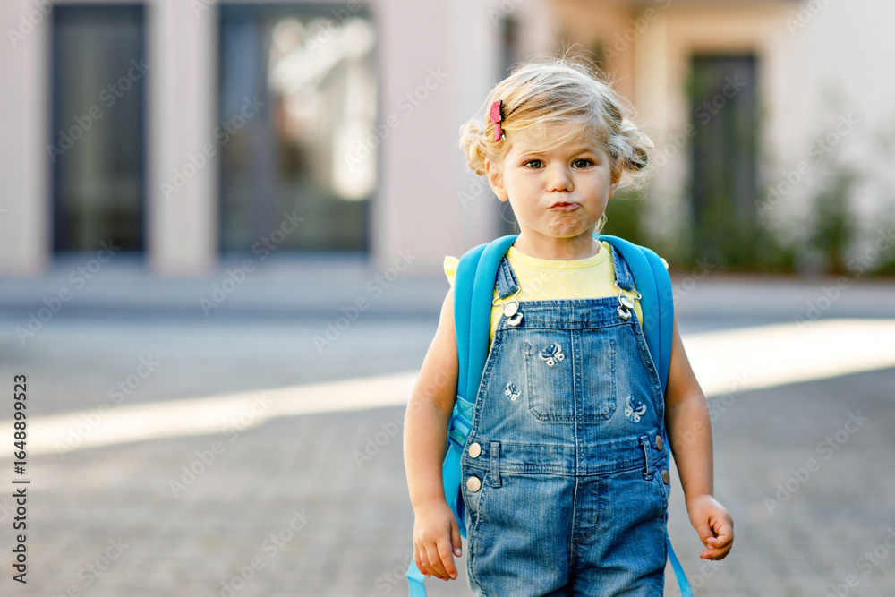 Cute little adorable toddler girl on her first day going to playschool. Healthy beautiful baby walking to nursery school and kindergarten. Happy child with backpack on the city street, outdoors.