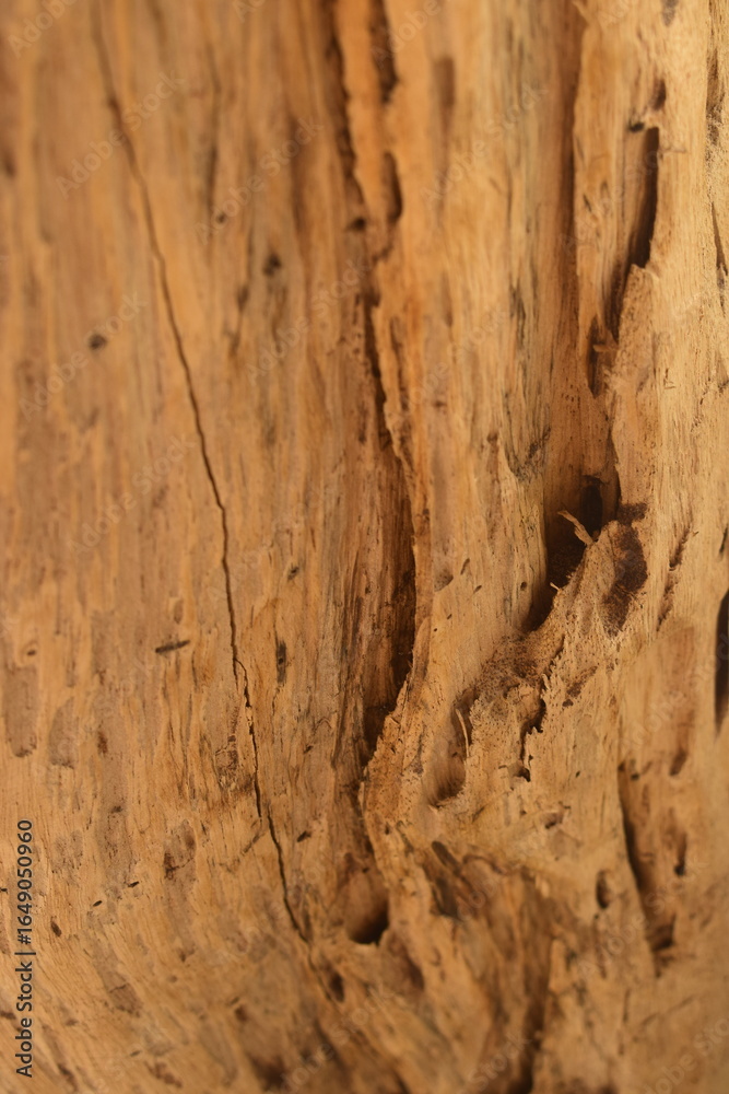 Cepo de cajueiro atacado por cupins, buracos de cupim no tronco de um tronco de cajueiro velho, antiga madeira do pé de caju comido por cupinzeiro, buracos e fendas