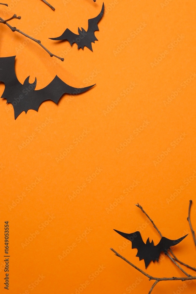 Vertical Halloween composition with black paper bats and branches on orange background, top view, space for text