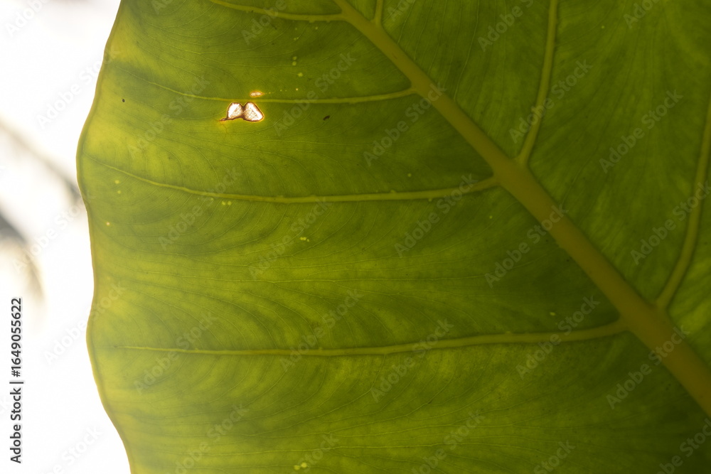 Folha de orelha de elefante, planta vintage de folha grande com sol de fundo, fibras verdes natural de folha de jardim
