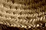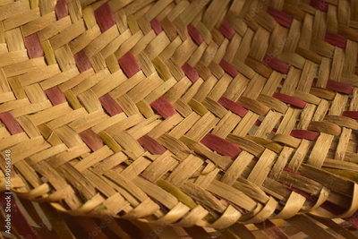 Aba de chapéu de fazendeiro feito de palha artesanal, fundo curvo de palhas secas trançadas, com algumas palhas vermelhas