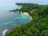 Aerial view of a small village on Rolas Island, São Tomé and Príncipe, surrounded by dense tropical jungle and simple tin-roof houses.