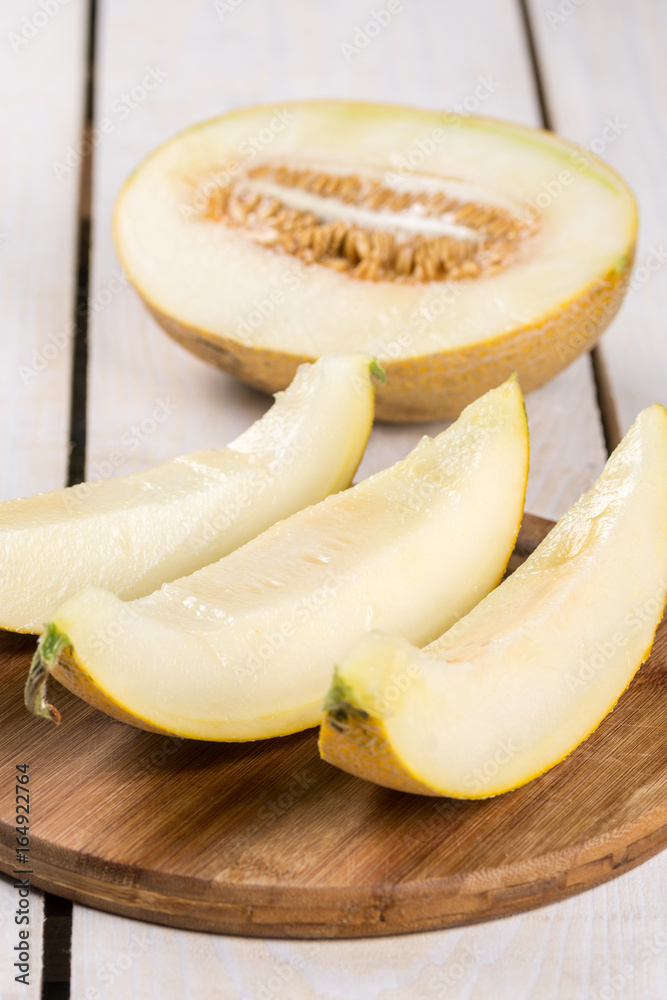 Three slices of fresh melon on the wooden kitchen board