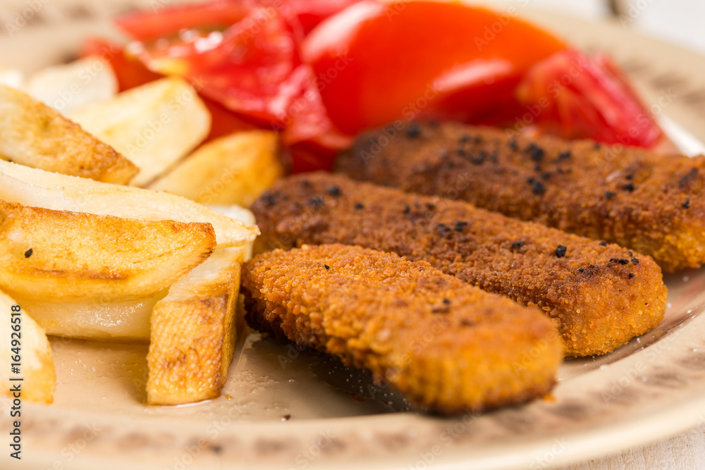 Served meal on the table, fried fish meat sticks with potatoes and tomato salad