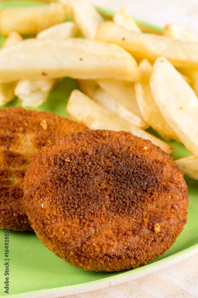 Fried fish meat burgers served with french fries on the plate