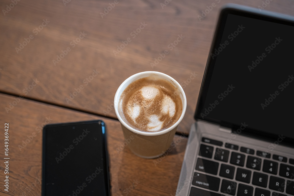 Close-up of Hot coffee latte with latte art milk foam in cup made of paper smartphone and laptop computer on wood desk office desk in coffee shop at the cafe,during business work concept