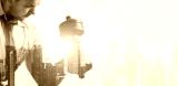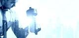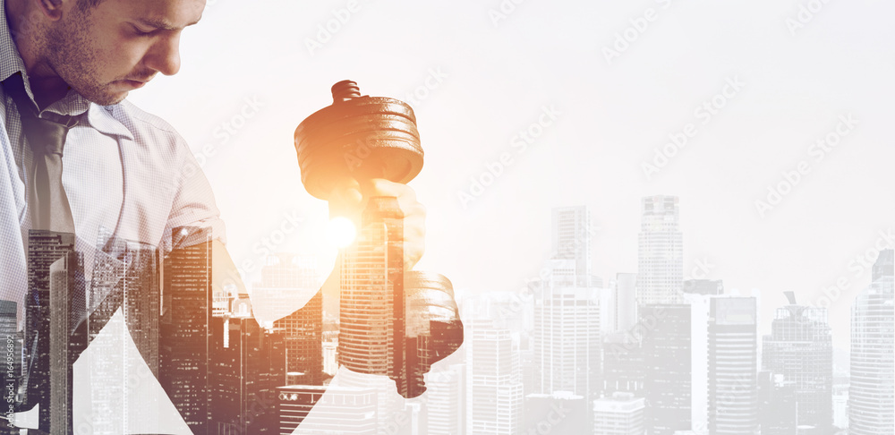 Hard working business concept. Strong businessman with dumbbell mixed with sunset city skyline