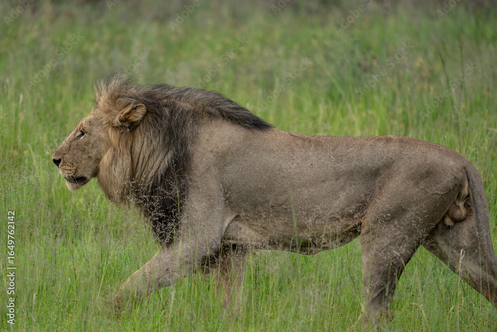 Close-up of a large male lion with an imposing stature and mane, stalking through the tall grass. Pilanesberg National Park, South Africa.