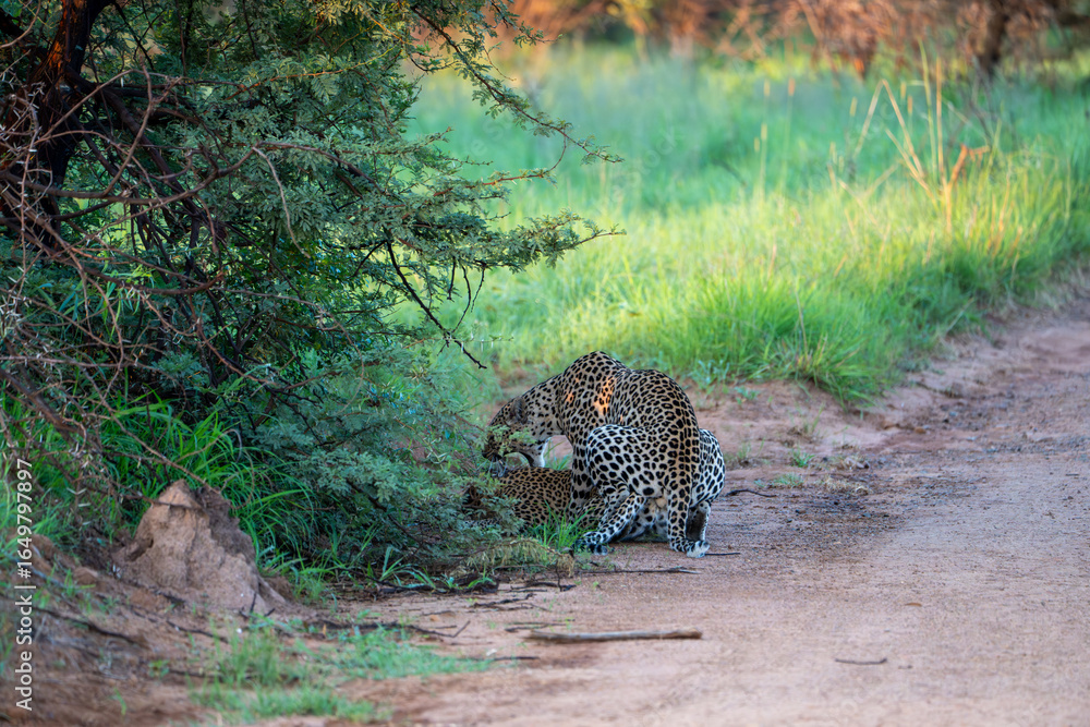 Two leopards caught in the act of mating. A fascinating sighting in Pilanesberg National Park, South Africa.
