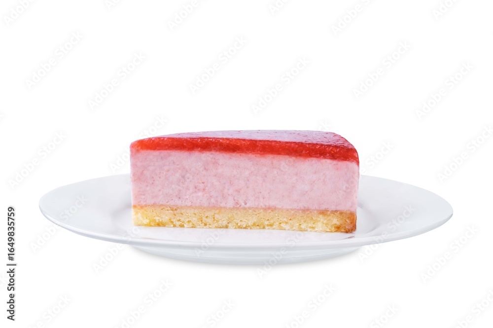 Strawberry mousse cake in a plate on a white isolated background