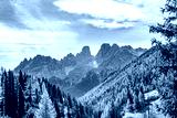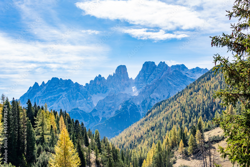 Breathtaking panorama of the Italian Alps, with dramatic blue mountains and a beautiful autumn-colored forest.
