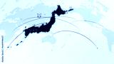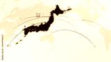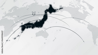International currency network, world map with Japanese yen as central hub, financial globalization, digital economy theme