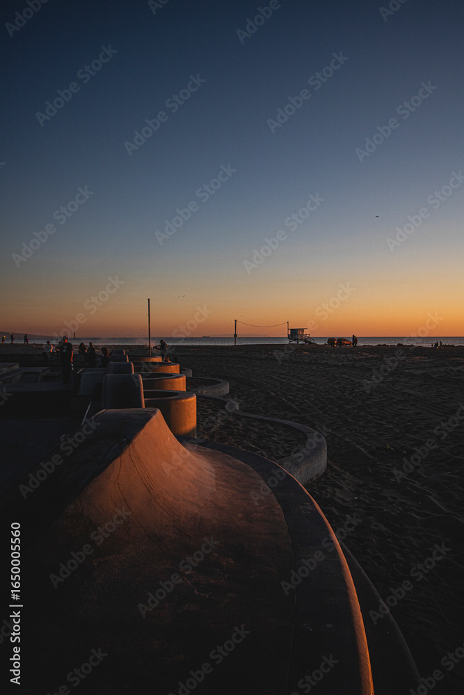 The most famous skate park on the world in Venice Beach during the sunset in Los Angeles.