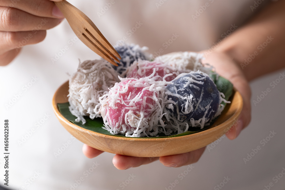 Thai coconut ball (Khanom Tom), Traditional Thai dessert made from boiled glutinous rice flour stuffed with sweet coconut and coated with shredded coconut