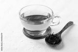 Black tea in cup glass with dried tea leaves in spoon on white background, Healthy herbal hot drink