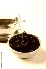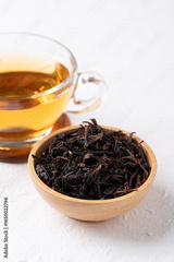Dried black tea leaves in wooden bowl and hot tea in cup glass on white background, Healthy herbal drink